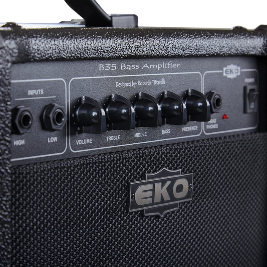 L'amplificatore Per Basso B 35 Nasce Dalla Collaborazione Fra Eko Guitars E Il Genio Tecnico Di Roberto Tittarelli Che Danno Vita Ad Un Prodotto Con Un Ottimo Rapporto Qualità-Prezzo E Un'ottima Verstilità Timbrica. Due Ingressi, Attivo E Passivo, Cono Da 10" E 35 Watt Di Potenza. Questo Amplificatore È L'unico Nella Sua Fascia Di Prezzo Ad Avere Il Tweeter Per Conferire Maggiore Incisività E Risaltare Gli Armonici Dello Strumento.