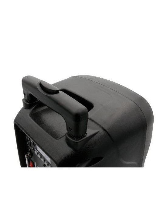 Diffusore acustico attivo biamplificato da 100W RMS, 200W Musicali, 1 microfono wireless VHF, lettore MP3/WAV con USB o SD/MMC, Radio FM a sistema TWS collegamento BlueTooth, caricatore USB, telecomando, batteria 12 V, possibilità di alimentazione 12 V esterna.