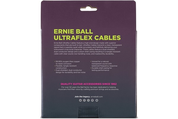 I cavi per strumenti Ernie Ball offrono un design high-end, garantito da componenti superiori, fatti per durare. I cavi per strumenti trasmettono un segnale pulito e trasparente, superbamente silenzioso, trasferendo in modo accurato e fedele tutte le frequenze prodotte dal vostro strumento. Questi cavi impiegano un design a doppia schermatura, doppio conduttore e un involucro appositamente concepito che assicurano la massima robustezza e durata, un suono chiaro e definito, e un bassissimo livello di rumore. Al 99.99% in rame oxygen-free per resistere alla corrosione. Costruzione flessibile, resistente ai nodi. Design a doppia schermatura, doppio conduttore per la massima durata e basso rumore. Con un suono naturale, trasparente con una risposta in frequenza bilanciata. Robusto involucro per prestazioni sempre affidabili.