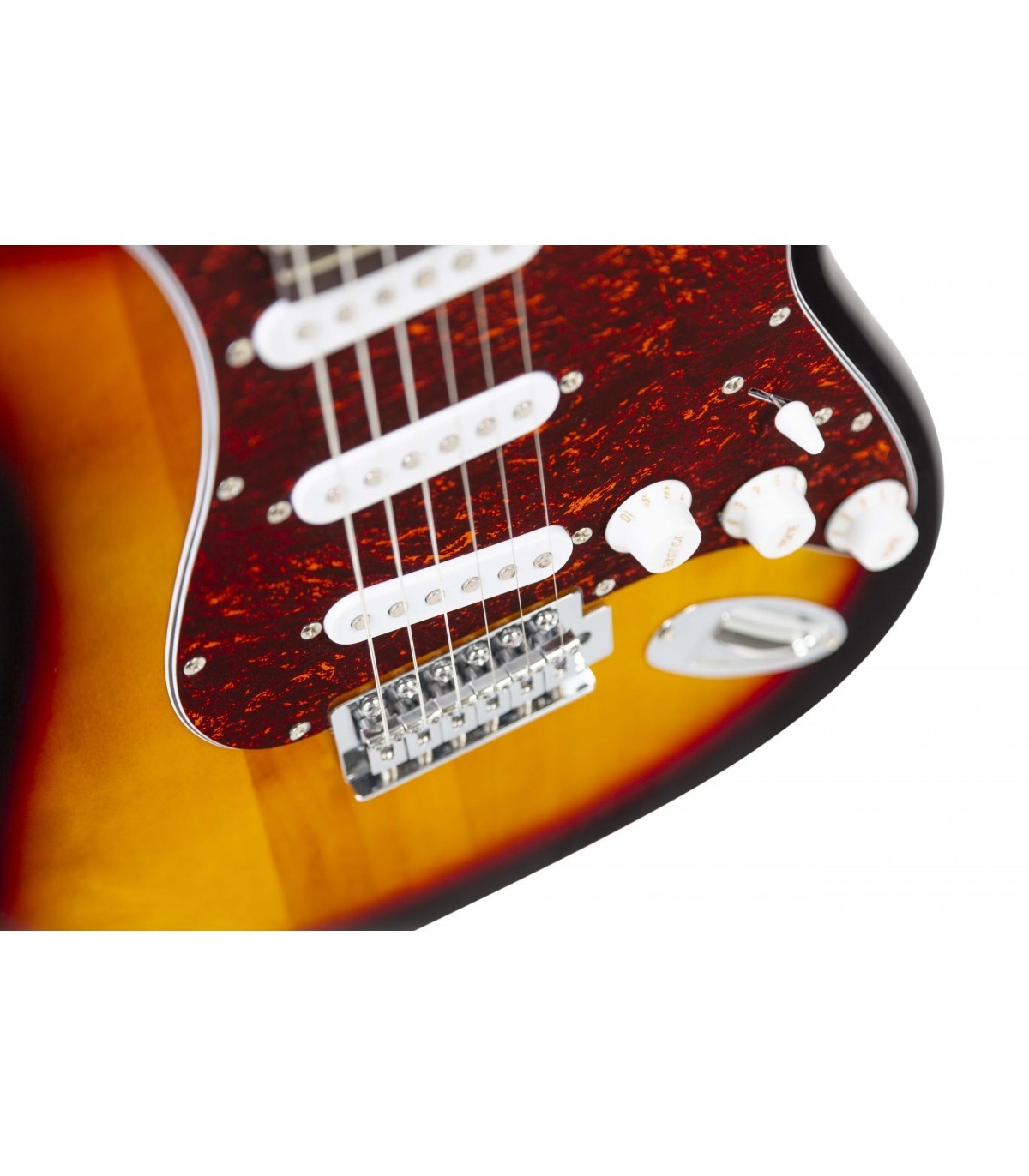 La De Salvo Strato Sunburst è una chitarra elettrica solid body dallo stile ispirato alla leggendaria Stratocaster. Con il suo corpo dal design ergonomico, la configurazione a tre single coil e la finitura Sunburst, è uno strumento perfetto per principianti e studenti che vogliono iniziare a suonare con una chitarra affidabile ed economica.