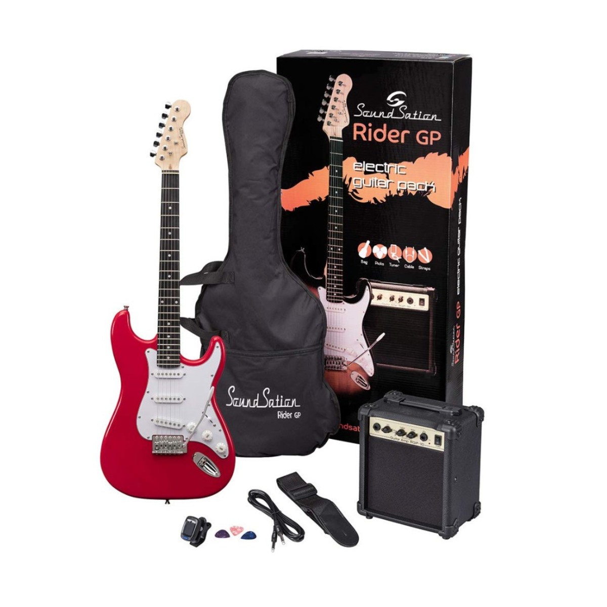 Se vuoi iniziare il tuo viaggio nel mondo della chitarra elettrica, Rider GP è il modo migliore per farlo. Il guitar pack include una chitarra Soundsation Rider-GP, un combo RGP-10 vintage style, un accordatore a clip per rimanere sempre accordati senza bisogno di cavi, una borsa, 3 plettri, cavo e tracolla. Tutto quello di cui hai bisogno è qui: ora tocca a te.