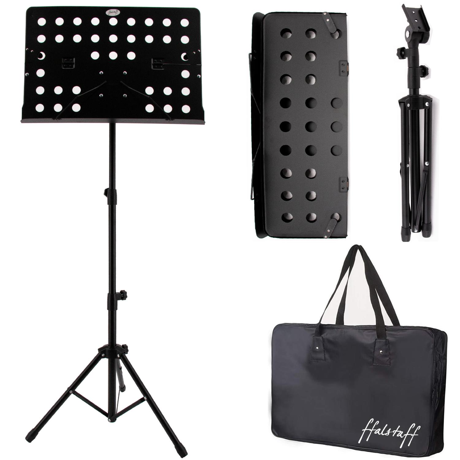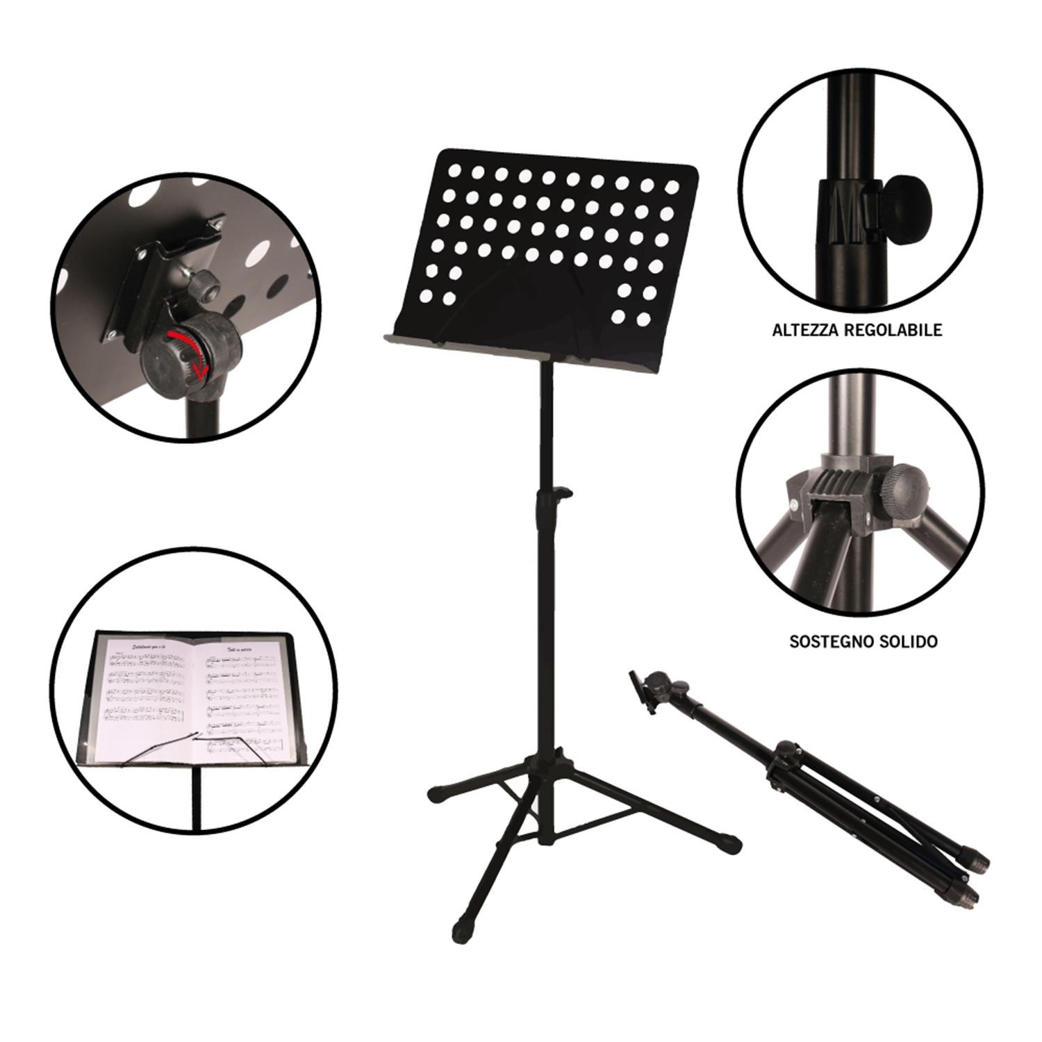 Leggio professionale per orchestra con tavola porta spartiti forata inclinabile e richiudibile, struttura in acciaio regolabile in altezza, verniciato nero