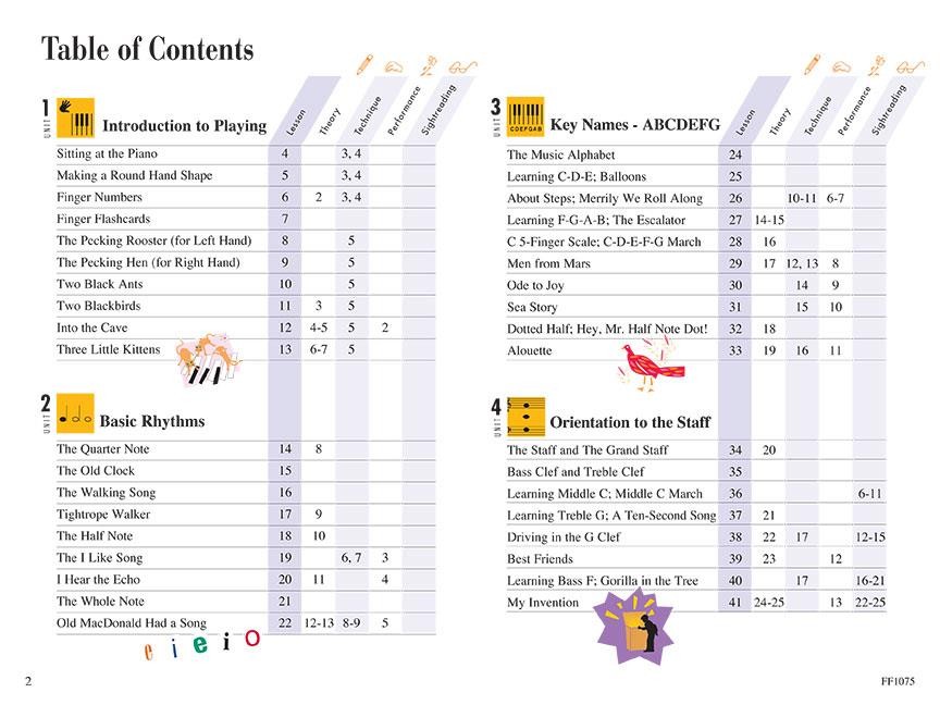La musicalità si costruisce attraverso l'uso della dinamica e della sperimentazione coloristica con il pedale. Il libro è organizzato in unità che rappresentano i principali concetti e competenze. Man mano che vengono introdotte nuove unità, i concetti e le competenze precedenti vengono costantemente rivisti.
