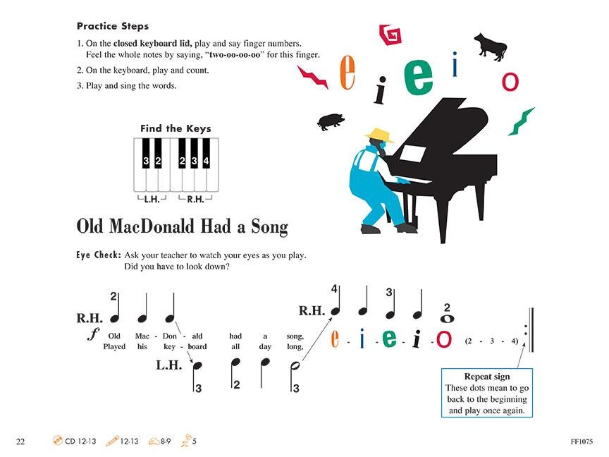 Gli studenti suonano con schemi in scala C a 5 dita, sviluppano il riconoscimento di passi e salti e imparano i nomi delle lettere indipendentemente dal numero del dito.