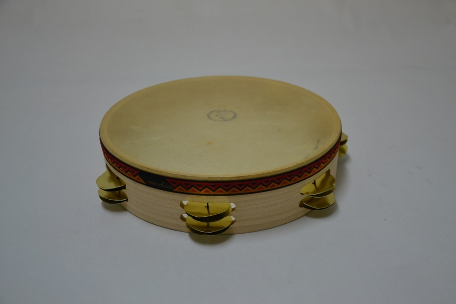 Tamburello artigianale di Torrepaduli fatto a mano in legno di Faggio con pelle di capretto. Larghezza 25 cm, altezza 6 cm, 12 sonagli di 4 cm