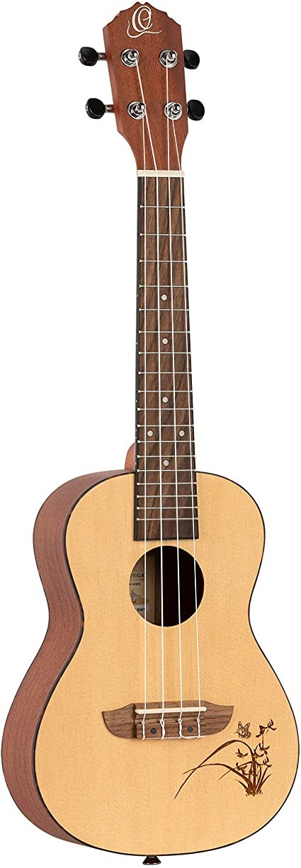 Con una brillantezza fantastica e un forte suono di gamma media, questo Ukulele della serie Bonfire è realizzato con un top in abete, fondo/fasce in sapele e manico in mogano, il tutto con finitura satinata naturale. Il noce di alta qualità viene utilizzato per la tastiera e il ponte che aggiunge un aspetto di fascia alta con una sensazione morbida. Per gli elementi visivi, è stata utilizzata una rilegatura in ABS in stile tartaruga fotogenica e sormontato il corpo con un design "Butterfly and Grass" inciso al laser vicino al ponte.
